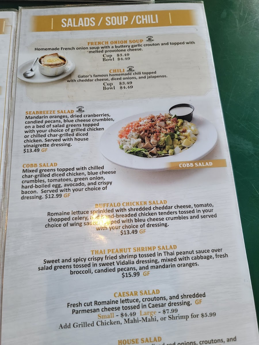 The Gatorizers shine with options like the mouthwatering Quesadilla Platter and crispy Mozzarella Cheese Sticks, perfect for sharing. Salads like the Cobb and Seabreeze offer refreshing contrasts amidst the savory dishes.